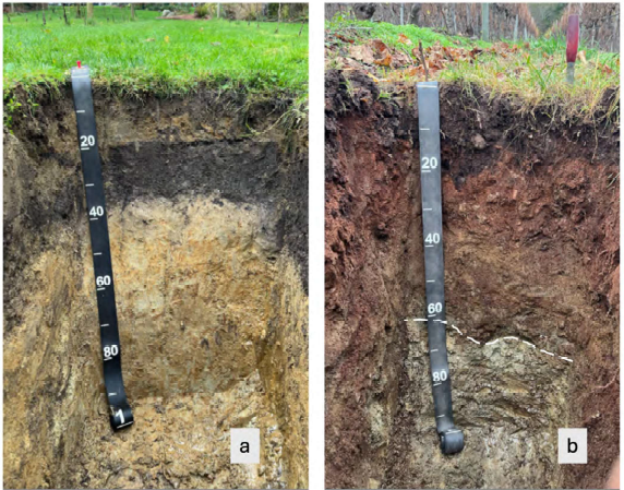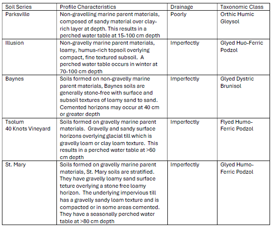 Scott reported "Two highly contrasting vineyard soils found. The Parksville soil (panel a) is composed of sandy material. The thick topsoil horizon and mottled yellowish colours beneath it indicate a soil that is saturated much of the year. The Tsolum soil (panel b), on the other hand, exhibits strong reddish colours indicative of oxidizing conditions. The profile comprises 65 cm of gravelly marine sediments overlying finer textured glacial till (gray material beneath the white line). The relatively impervious till material can generate a temporary perched water table in the Tsolum soil.