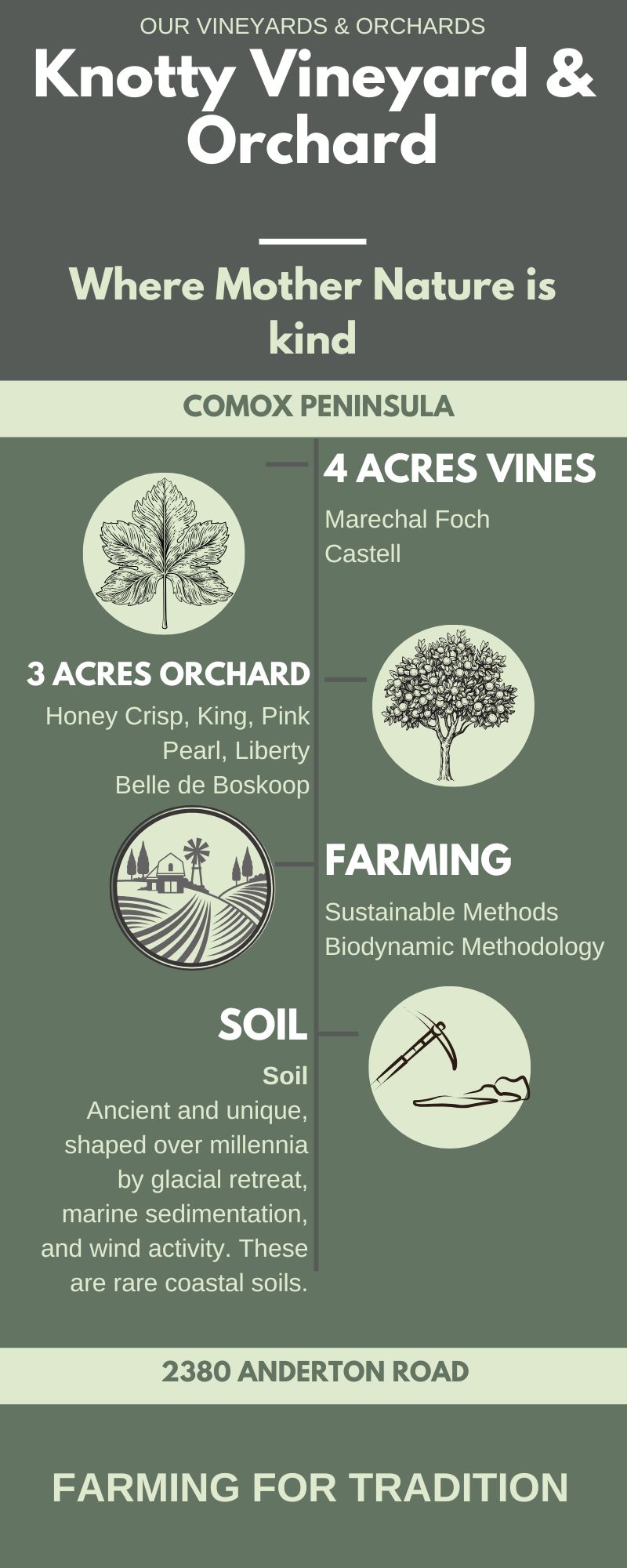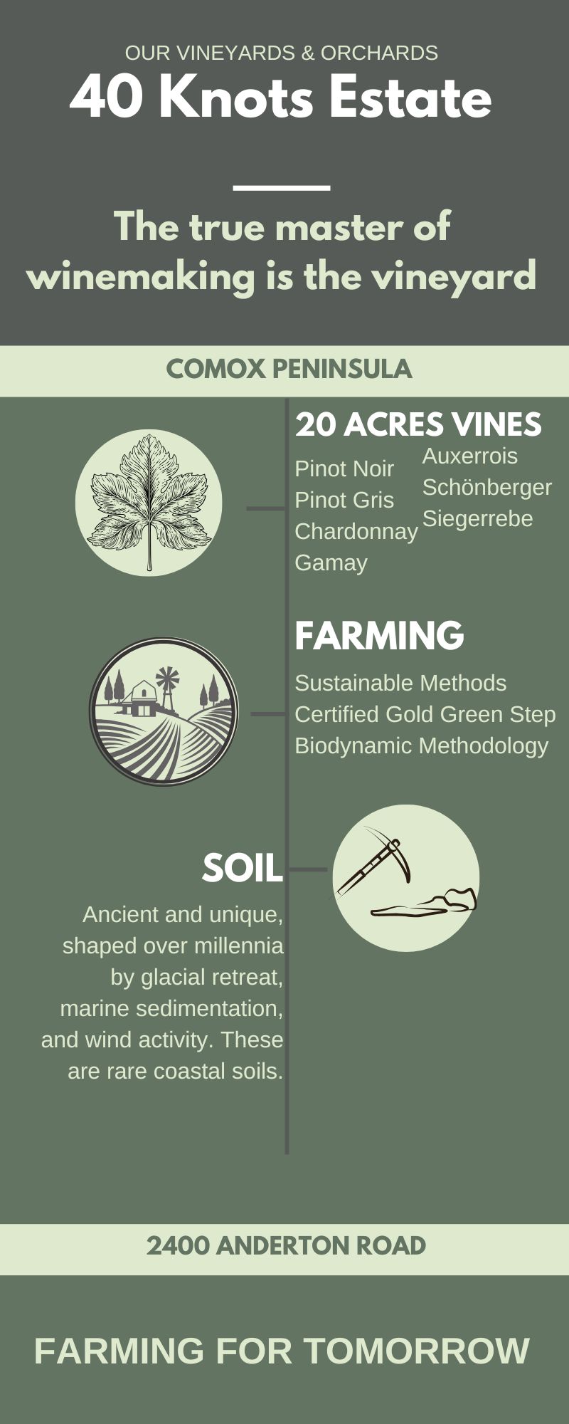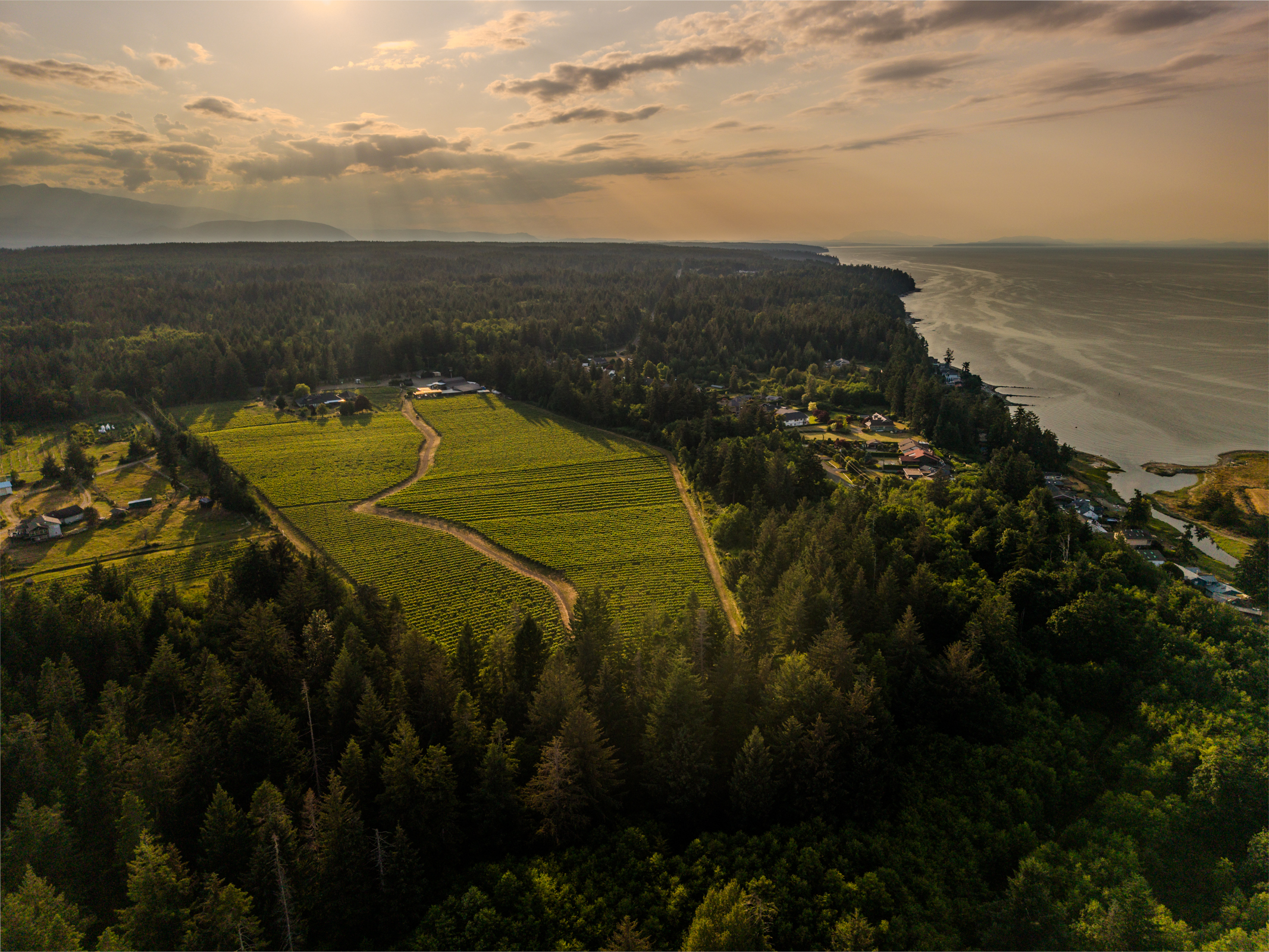 At 40 Knots Winery, our vineyards and orchards are the heart and soul of our winemaking process. Nestled on the picturesque Comox Peninsula, our vineyards and orchards benefit from the unique coastal climate of British Columbia, where the cool ocean breezes, fertile soil, and abundant sunshine create the perfect environment for growing premium grapes and apples for delicious cider.