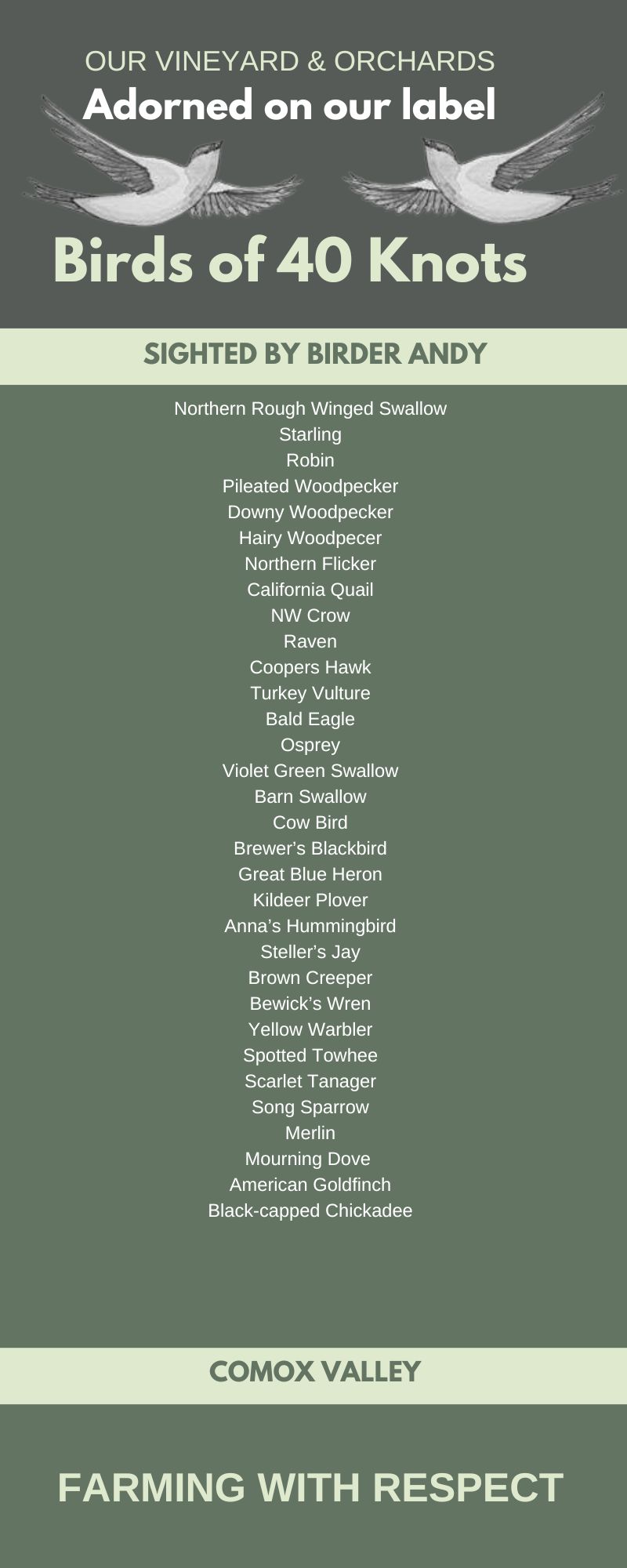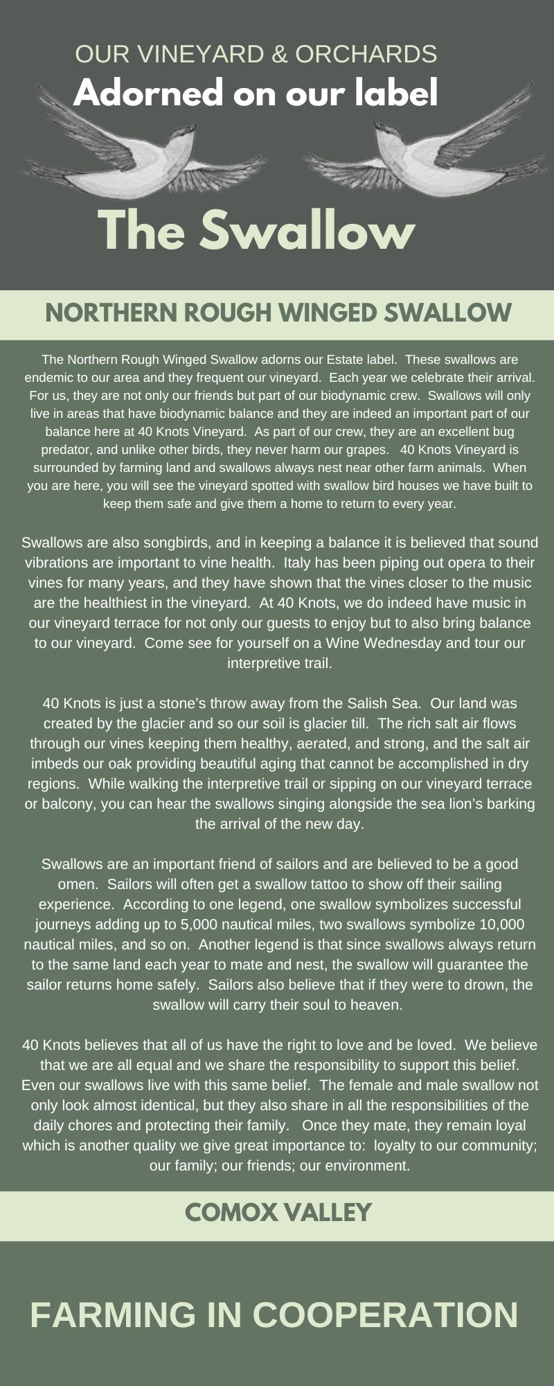 There is something very special about our land here. Just stepping foot onto the property, you can feel it even if you can't explain it. Our glacier till soil, adjacent to the Salish Sea, makes us indeed a rarity. Can you taste the difference in our wine? Indeed you can, but we will let you be the judge of that. Come take a stroll through our interpretive trail and learn about how we grow. It is a wonderful walk any day of the year. If you listen carefully you can hear the sea lions playing, the swallows that adorn are label are soaring above you, and it is quiet enough to hear the lady bugs having a sip of wine.